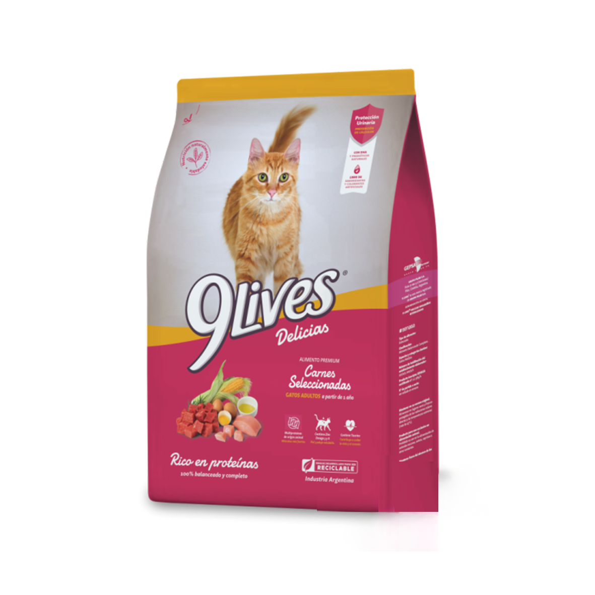 Alimento balanceado 9 Lives diseñado para gatos adultos. Contiene proteínas de origen animal (harina de carne, pollo, huevo), cereales (maíz, arroz, trigo), leche en polvo y grasa animal como base, además de vitaminas, minerales (zinc, hierro, cobre), taurina para la visión y corazón, prebióticos para la digestión y antioxidantes para el sistema inmunológico