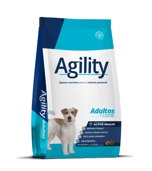 Agility Adultos Razas Pequeñas es una fórmula especialmente ideada para promover óptimos niveles de energía y vitalidad, basada en su tecnología Healthy Complex: una combinación de nutrientes minuciosamente seleccionados para que tu perro mantenga siempre su máximo potencial.