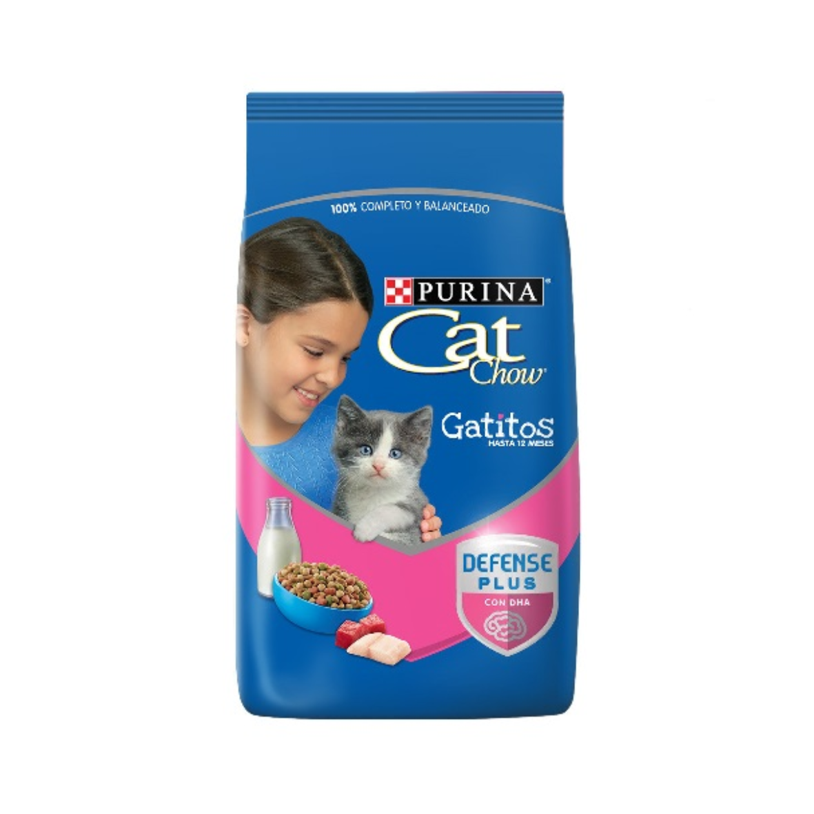 Alimento balanceado Cat Chow diseñado para gatos cachorros. Contiene proteínas animales (pollo, carne), DHA para cerebro y visión, zinc y Omega 3 y 6 para piel/pelo, calcio para dientes, vitaminas y un prebiótico natural para la digestión y sistema inmune, sin colorantes ni sabores artificiales, apoyando un crecimiento saludable.