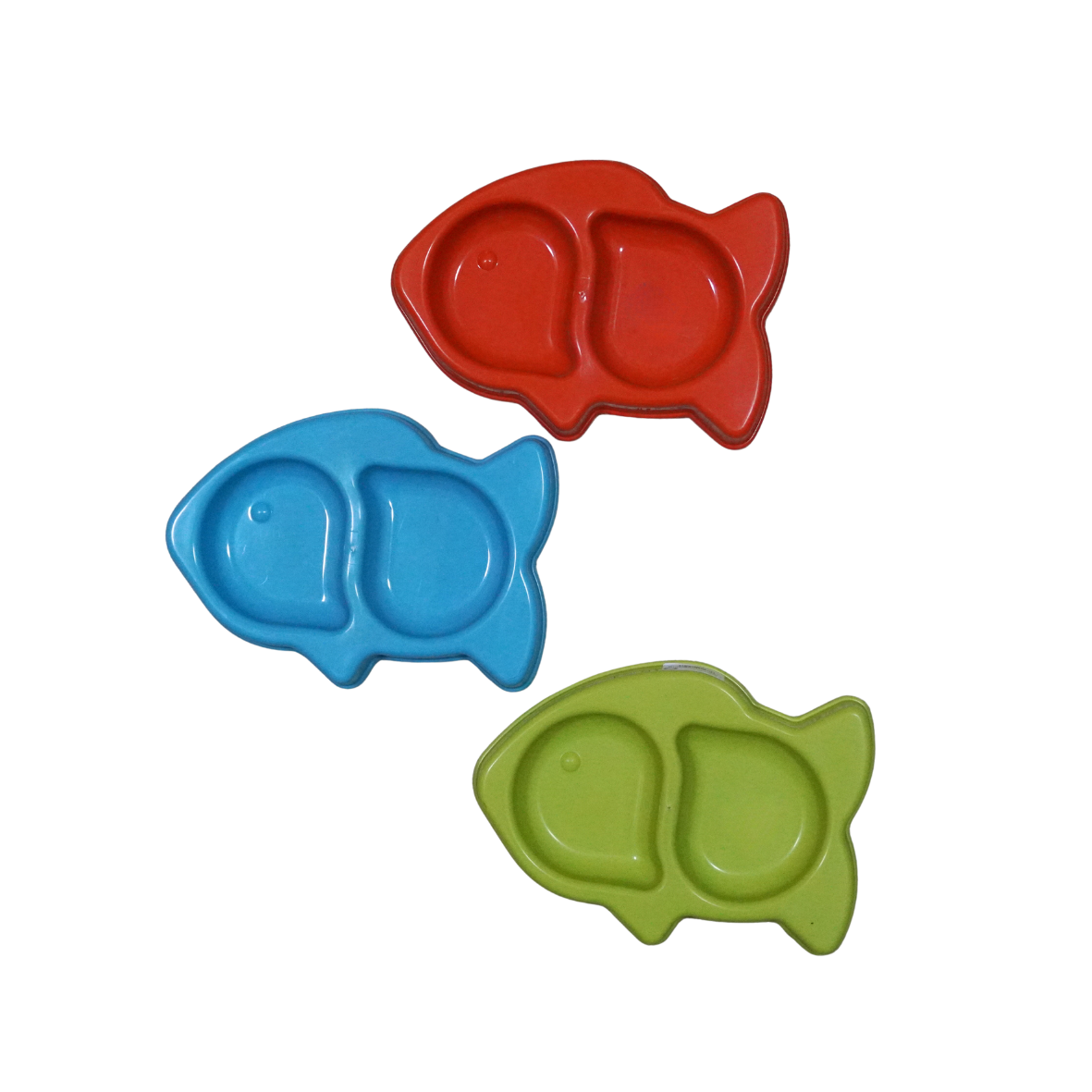 Comedero de plástico con forma de pez. Puede funcionar como comedero y bebedero gracias a su diseño.