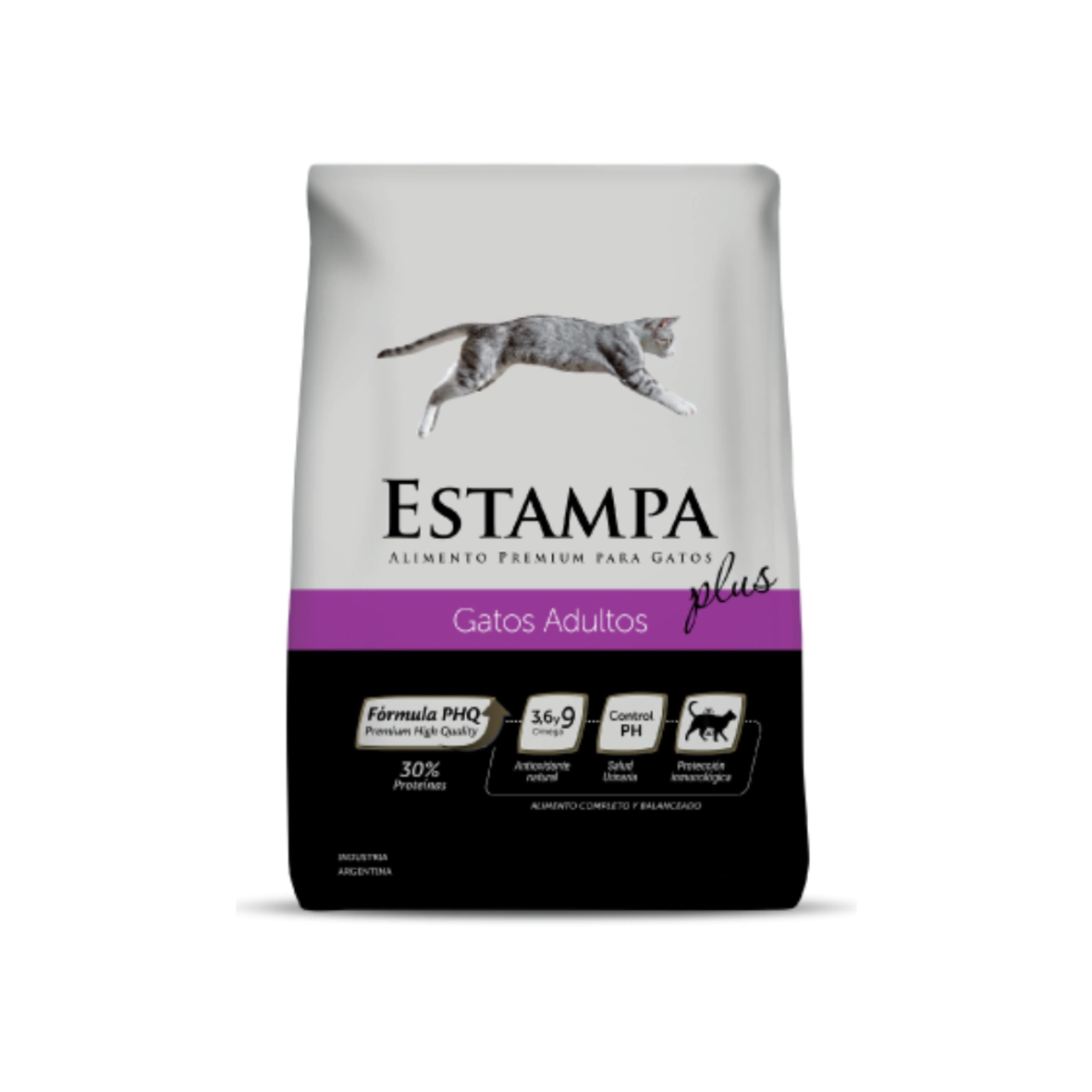 Alimento balanceado Estampa diseñado para gatos adultos. Contiene proteínas de alto valor biológico, Omega 3, 6 y 9, antioxidantes naturales, y fibras, formulado para el desarrollo muscular, salud de piel y pelaje, y el sistema inmunológico, además de ingredientes funcionales como extracto de romero y yuca schidigera para la salud digestiva, asegurando una nutrición completa y equilibrada.