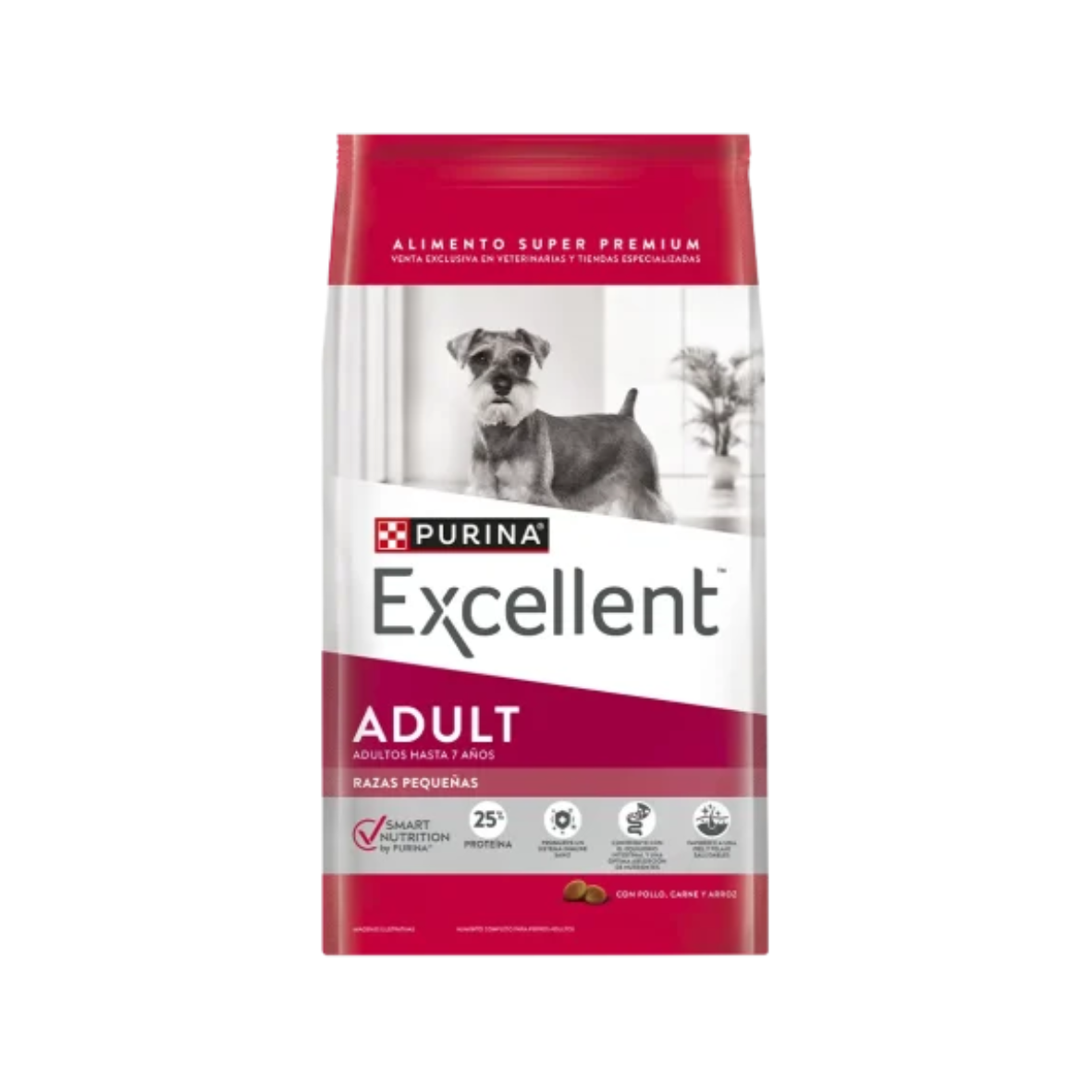 Alimento balanceado premium Excellent diseñado para perros adultos de raza pequeña. Aporta proteínas de alta calidad para músculos fuertes, ácidos grasos Omega 3 y 6 para piel y pelaje saludables, inulina (prebiótico) para la salud digestiva y heces firmes, antioxidantes para el sistema inmune, y minerales para la salud oral, todo con sabor a pollo y arroz, sin colorantes ni saborizantes artificiales.