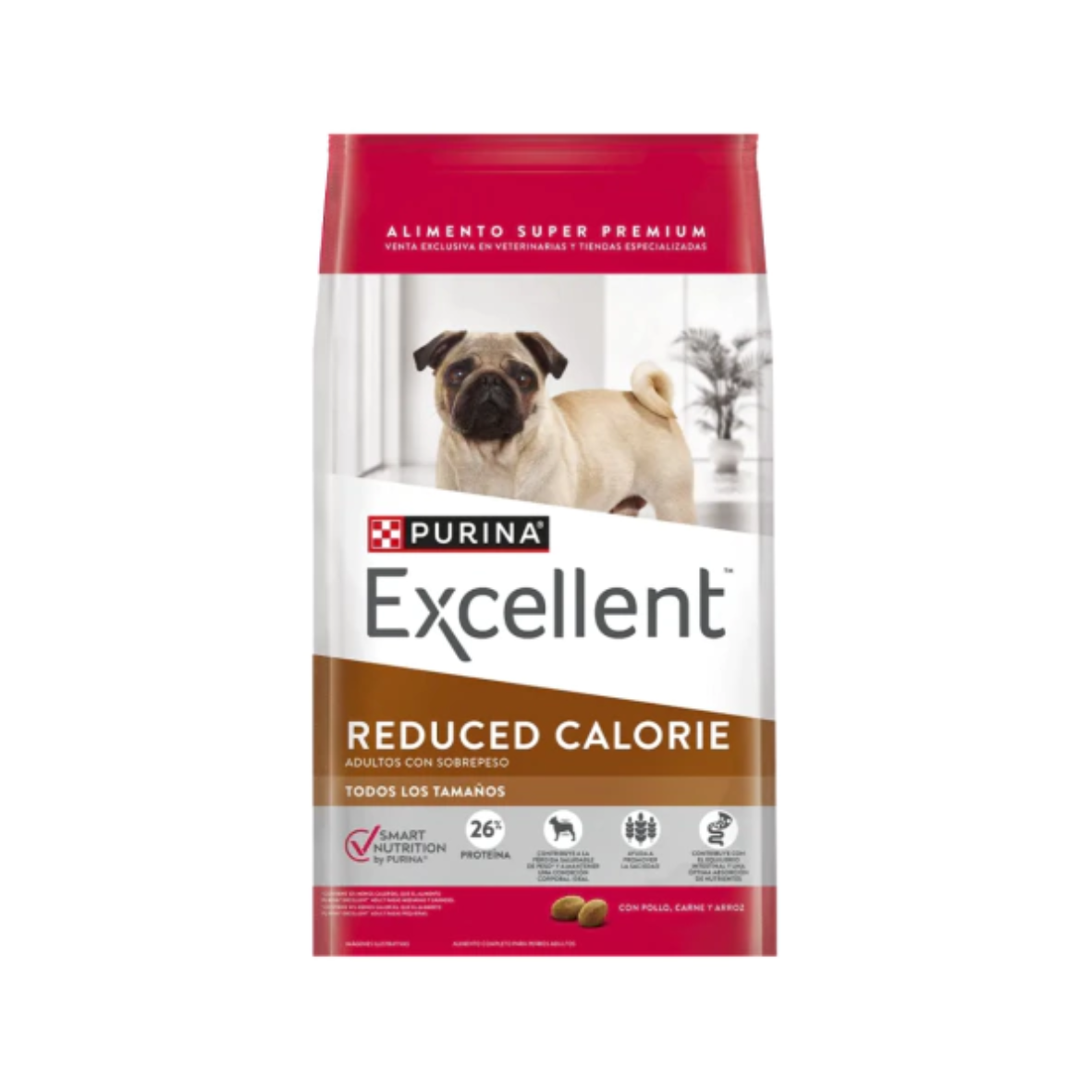Alimento balanceado premium Excellent diseñado para perros de todos los tamaños con tendencia al sobrepeso o vida sedentaria. Su formula ofrece alta proporción de proteínas y bajo contenido de grasa, e incluye fibras y prebióticos para la saciedad y salud digestiva, además de Omega 3 y 6 para piel y pelaje sanos, con ingredientes como pollo, arroz y maíz.