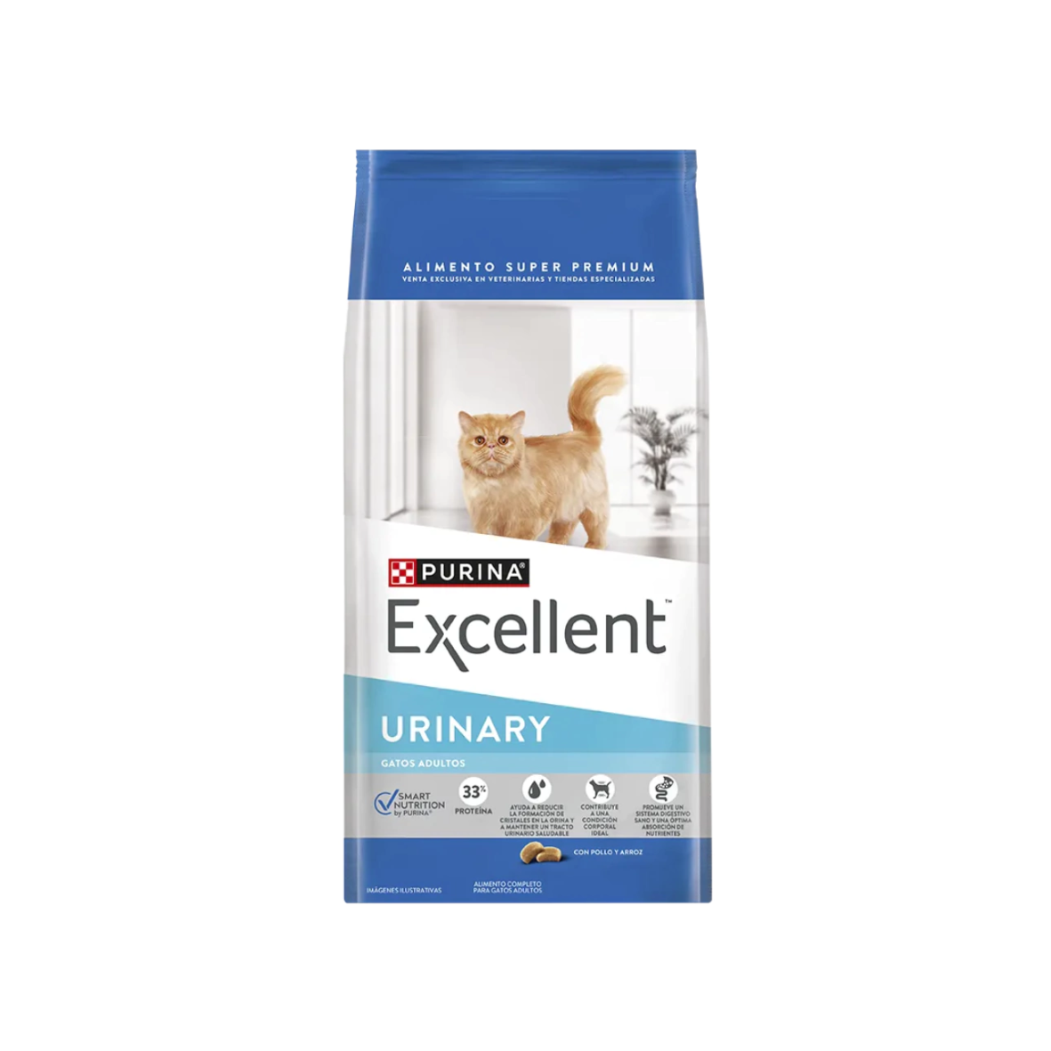 Alimento balanceado Excellent diseñado para gatos con complicaciones urinarias. Contiene proteínas de alta digestibilidad (pollo y arroz) para ayudar a mantener un tracto urinario saludable y reducir la formación de cristales, promoviendo la hidratación mediante un balance de minerales y un ligero aumento de sal para estimular la sed.
