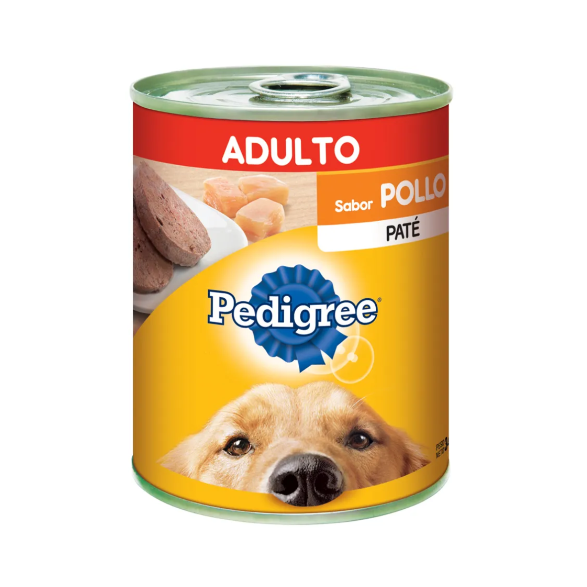 Lata de 340g con alimento nutritivo Pedigree diseñado para perros adultos. Sabor carne o pollo. Contiene agua, carnes y/o subproductos animales, derivados de cereales (maíz, arroz, trigo), concentrados proteicos vegetales, aceites (pollo, vegetal), vitaminas (A, D3, E, complejo B), minerales (calcio, zinc, cobre) y aditivos como espesantes, gelificantes y antioxidantes.