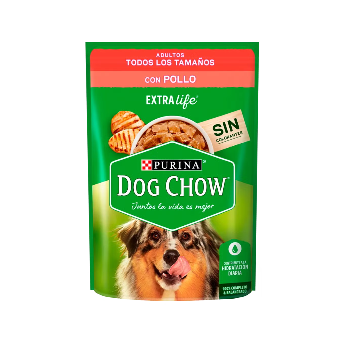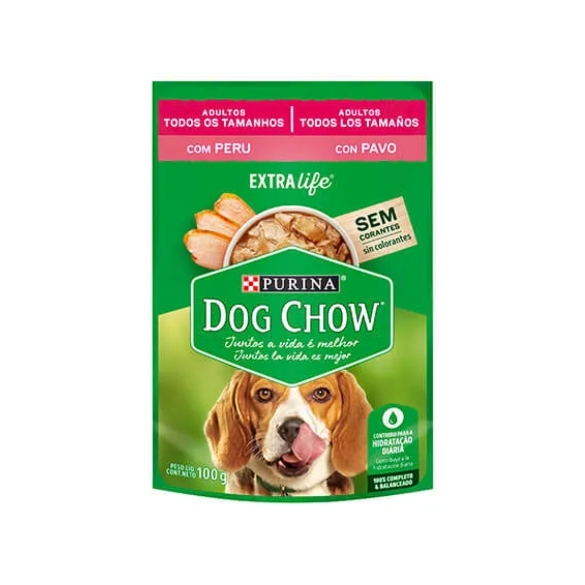 Alimento húmedo en sobre marca Dog Chow, diseñado para perros adultos. Contiene proteínas animales (pavo, pollo, res, cerdo), carbohidratos (almidón de maíz, gluten de trigo, soja), vitaminas y minerales esenciales (A, D3, E, B, zinc, hierro, cobre), y antioxidantes para promover la salud, energía y pelaje, a menudo destacando su mezcla de ingredientes para una buena digestión y sin conservantes artificiales.