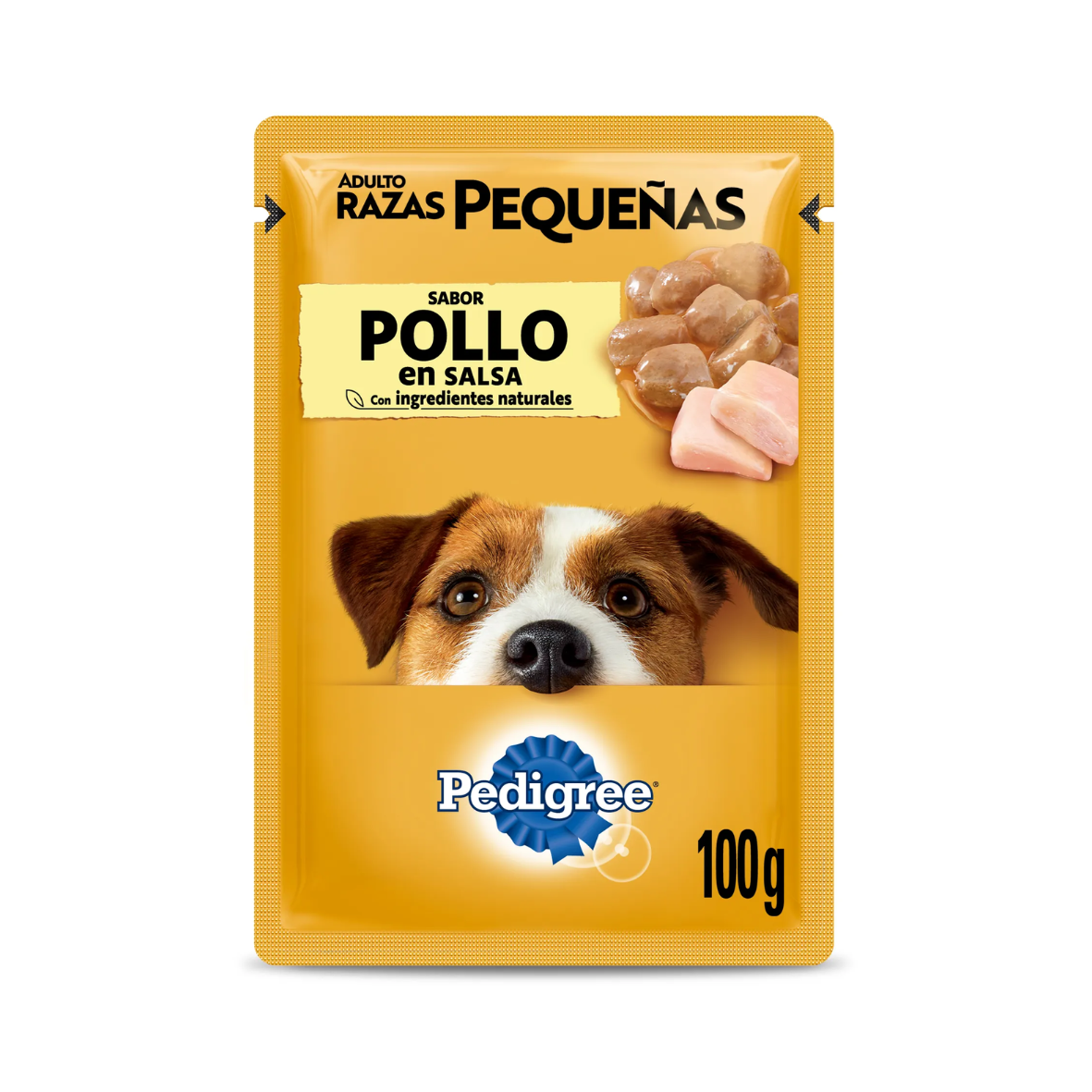 Pouch nutritivo Pedigree para perros adultos de razas pequeñas. Es un alimento húmedo completo y balanceado en formato de sobre, con trocitos de carne o pollo cocidos al vapor en una deliciosa salsa, ideal para perros adultos de raza pequeña, ofreciendo hidratación, energía y nutrientes esenciales.
