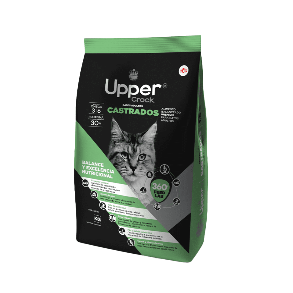 Alimento balanceado Upper diseñado para gatos castrados. Ofrece 30% de proteínas, que incluye proteínas de ave y pescado, arroz y gluten de maíz, formulado para gatos esterilizados con fibras naturales para el control de peso y formación de bolas de pelo, antioxidantes, Omega 3 y 6 para piel y pelaje, taurina y minerales esenciales para la salud urinaria y general.